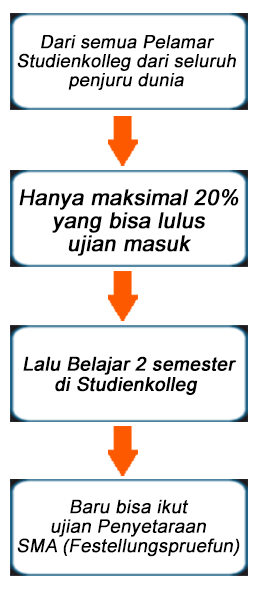 Untuk bisa lulus Ujian diatas Siswa harus belajar terlebih dahulu normalnya 2 semester di STUDIENKOLLEG. UJIAN MASUK-nya disebut AUFNAHMEPRÜFUNG , di singkat ANP. Sayangnya hanya sekitar maksimal 20% Pendaftar bisa lulus.